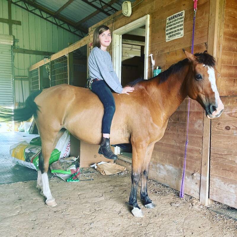 Pumpkin thrives on games and challenges. Whether it's barrel racing, jumping three feet barefoot backwards (if you dare!), or seeing how many kids can fit on her back, she's always game. Her love for children is evident, especially those eager for adventure and ready to try something new. She's also a total goofball who will playfully paw until she gets all the attention she craves—and we wholeheartedly indulge her.